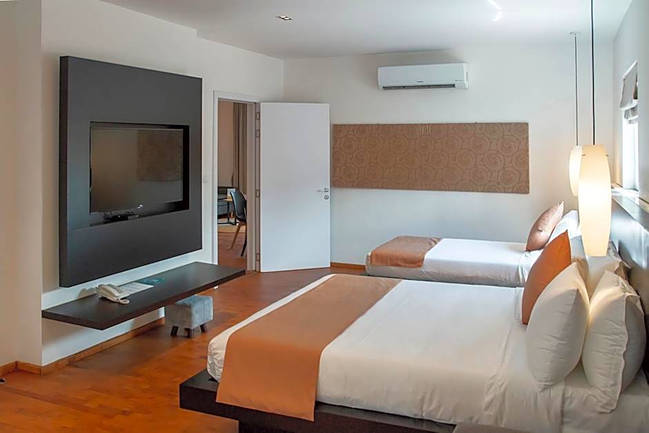 By interconnecting the Executive Suite with the double bedded Deluxe Double Studio, the whole space becomes an astonishing 2-room Suite measuring over 125m2 and sleeping up to 4 guests and 2 kids. The room features 2 in suite bathrooms and toilets, 50-inch satellite TV's, 2 kitchenettes, dining sets, sofas in the living room.